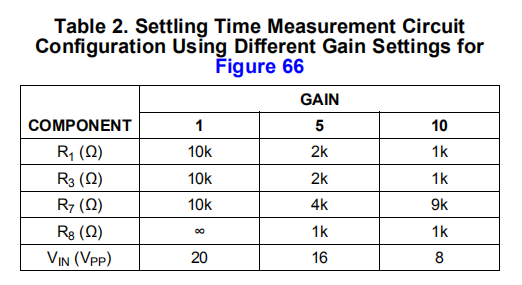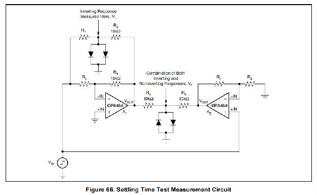 图66中的电路用于测量稳定时间响应。电路的左半部分是一个标准的假和结测试电路,用于测量稳定时间和开环增益。R1和R2提供增益并允许测量,而无需将示波器探头直接连接到求和结,这可能会通过引起振荡来干扰适当的运算放大器功能。