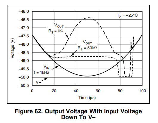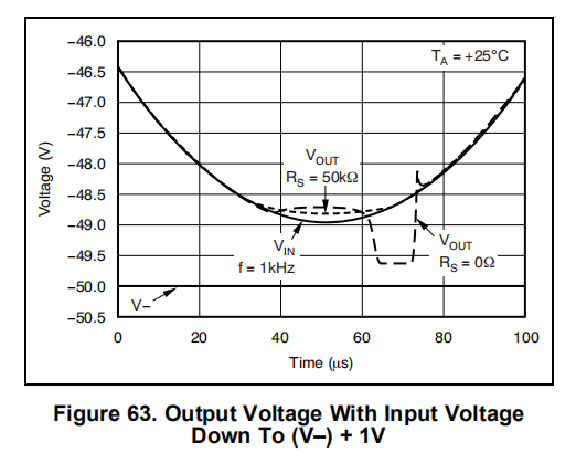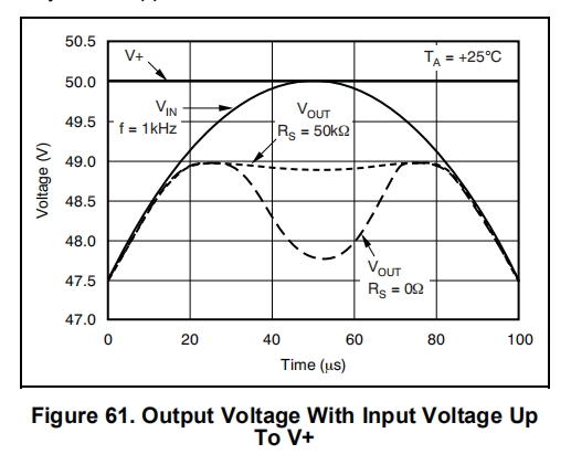 OPA454被指定为提供线性操作,输入摆幅在任一电源的2.5V范围内。一般来说,+1的增益是最苛刻的配置图61和图62使用图64所示的电路,显示了当输入摆动到轨道的0V范围内时的输出行为。图63显示了一个输入信号的行为,该信号在轨道的1V范围内摆动,也使用了图64中的电路。注意,相位反转效应的开始可以通过在正输入的连接中插入串联电阻(RS)来减小。请注意,VOUT不会一直摆动到对面的轨道。
