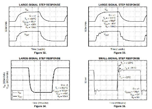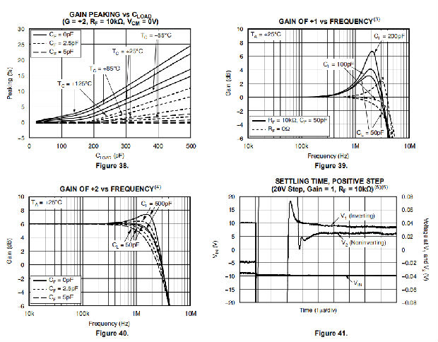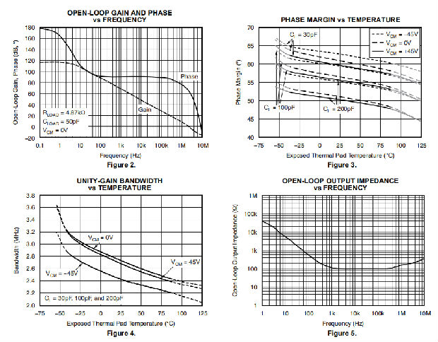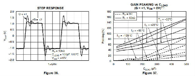 在非互易单位增益结构下,随着正共模电压的增加和温度的升高,OPA454具有更多的增益峰值。负共模电压越大,增益峰值越小。与所有运算放大器一样,增益峰值随着电容性负载的增加而增加。在反馈通道中设置电阻和小电容可以减少增益峰值,提高稳定性。