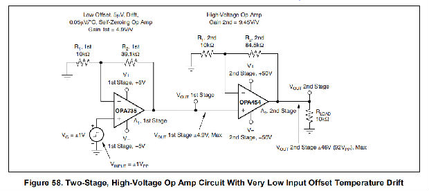 OPA454可与OPA735零漂系列运算放大器一起使用,以创建具有极低输入偏移温度漂移的高压运放电路。该电路如图58所示。
