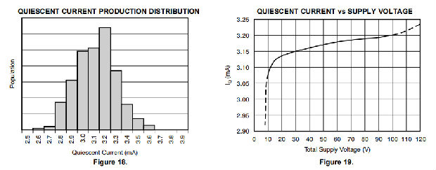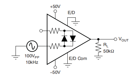 有些应用不需要相等的正、负输出电压摆幅。电源电压不需要相等。OPA454在电源之间的电压最小为10伏,电源之间的电压为100伏。例如,正电源可以设置为90V,负电源设置为–10V,反之亦然(只要总电源小于或等于100V)。
