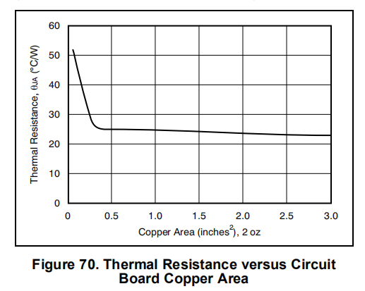 封装热阻θJA受安装工艺和环境的影响。空气流通不良和使用插座会显著增加对周围环境的热阻。许多运算放大器放在一起也会增加周围的温度。最佳的热性能是通过将运算放大器焊接到具有宽印刷电路痕迹的电路板上,以允许通过运算放大器引线进行更大的传导。将电路板的铜面积增加到大约0.5in2会降低热阻;但是,超过0.5in2时,会出现最小程度的改善,如图70所示。