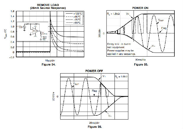 图68显示了插入式OPA454的热关机行为,其内部耗散1W。未焊接,且在插座中,DDA封装的θJA通常为+128°C/W。插座温度为+25°C时,输出级温度上升至+150°C的关机温度,从而触发设备的自动热关机。设备保持热关机(输出处于高阻抗状态),直到冷却到+130°C,然后再次通电。这种热保护迟滞特性通常可防止放大器离开安全工作区,即使输出与接地或任一电源之间存在直接短路。发生灾难性击穿的轨对轨供电电压在+25°C时通常为135V。但是,绝对最大规格为120V,在任何情况下,OPA454不应超过120V。热保护结构无法防止由电流尖峰进入感性负载(特别是电源电压升高)引起的故障。