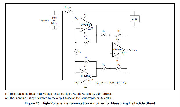 图75使用三个OPA454s来测量高压侧并联应用中的电流。VSUPPLY必须大于VCM。VCM必须在(V-)+2.5V和(V+)-2.5V之间。遵守这些限制条件可使V1和V2保持在OPA454线性运行所需的电压范围内。例如,如果V+=50V且V–=50V,则V1=+47.5V(最大)和V2=–47.5V(最小)。最大电源电压等于±50V,或总计100V。