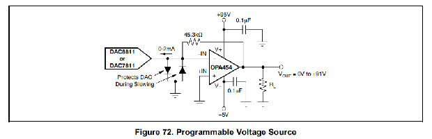 图72和图73分别说明了可编程电压源和桥接电路中的OPA454。