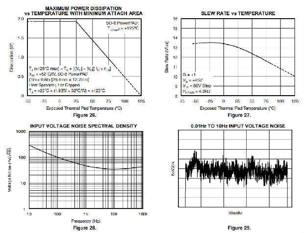 OPA454有SO-8和HSOP-20 PowerPAD版本,在模具和封装外部之间提供极低的热阻(θJC)路径。这些包装有一个外露的热垫。该热垫与模具直接热接触;因此,通过提供远离热垫的良好热路径,可获得优异的热性能。