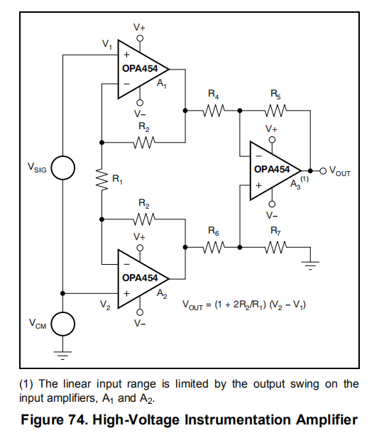 图74使用三个OPA454创建一个高压仪表放大器。VCM±VSIG必须介于(V-)+2.5V和(V+)-2.5V之间。最大电源电压等于±50V或100V。
