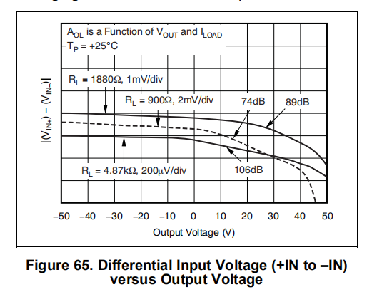 图65显示了AOL和输出电压的非线性关系。如图65所示,与负电压电平相比,正输出电压电平下的开环增益更低。电气特性表中的规格基于在两个输出端测得的平均增益。