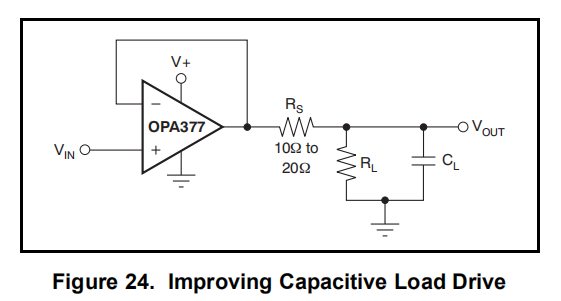 在单位增益配置的OPAx377可以直接驱动高达250pF的纯电容负荷。增加增益增强了放大器驱动更大电容性负载的能力;参见典型特征曲线,小信号过冲与电容性负载。在单位增益配置中,电容性负载驱动可以通过插入一个小的(10Ω到20Ω)电阻器RS与输出串联来改进,如图24所示。这种电阻器在保持纯电容性负载的直流性能的同时显著降低了振铃。然而,如果电阻负载与电容负载并联,则会产生分压器,在输出端引入增益误差,并略微减小输出摆幅。引入的误差与比值RS/RL成正比,在低输出电流水平下通常可以忽略不计。