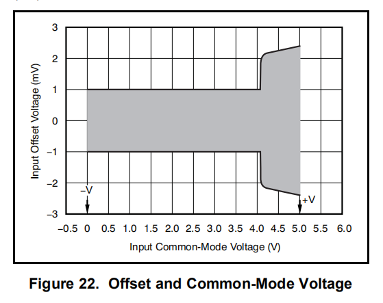 OPA377系列的输入共模电压范围超出电源轨100mV。放大器的偏移电压很低,从大约(V-)到(V+)-1V,如图22所示。当共模电压超过(V+)-1V时,偏移电压增加。共模抑制从(V-)到(V+)-1.3V。