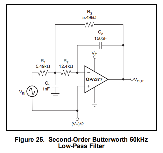 OPA377系列非常适合于要求宽带宽、快速转换率、低噪声、单电源操作的滤波器应用放大器。图25显示50kHz,二阶,低通过滤器所选组件可提供最大平坦的巴特沃斯响应。在截止频率之外,滚降为–40dB/dec。Butterworth响应非常适合需要可预测增益特性的应用,例如在模数转换器(ADC)之前使用的抗混叠滤波器。