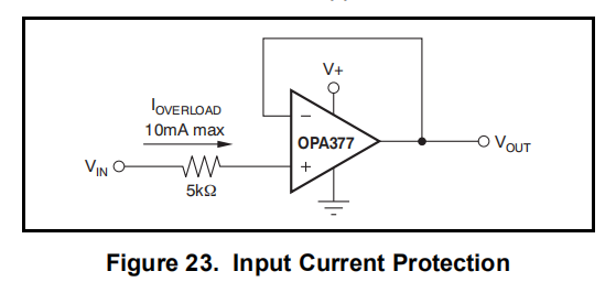 OPA377系列在所有引脚上都集成了内部静电放电(ESD)保护电路。对于输入和输出引脚,这种保护主要由连接在输入和电源引脚之间的电流控制二极管组成。这些ESD保护二极管还提供电路内、输入过驱动保护,只要电流限制在绝对最大值10mA评级。图23显示了如何将串联输入电阻器添加到驱动输入以限制输入电流。这个附加电阻会在放大器输入端产生热噪声,在对噪声敏感的应用中,其值应保持在最小值。