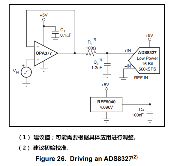 OPA377系列的低噪声和宽增益带宽使其成为ADC.图26说明了OPA377驱动ADS8327,16位,250kSPS转换器。放大器连接为单位增益,无转换缓冲器。
