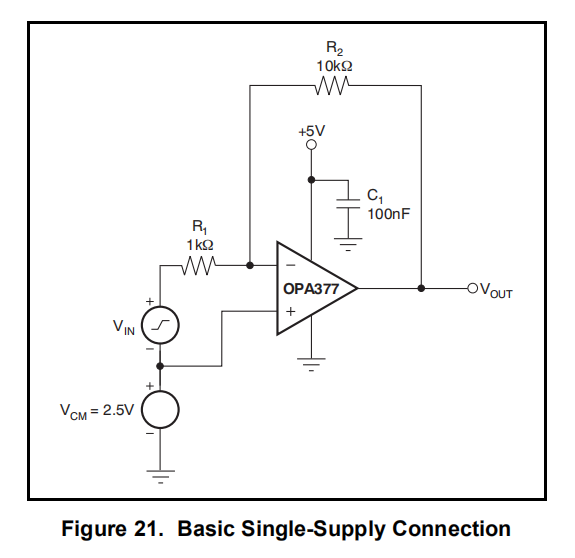OPA377家族团结稳定。当输入过驱动时,它不会出现输出相位反转。典型的单电源连接如图21所示。OPA377被配置为一个增益为–10V/V的基本逆变放大器。该单电源连接的输出以共模电压VCM为中心。对于所示电路,此电压为2.5伏,但可能是共模输入电压范围内的任何值。