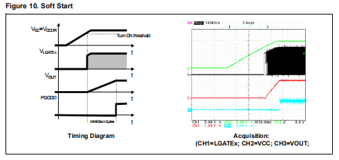 在启动时,产生一个斜坡,将回路参考从0V增加到VID in编程的最终值2048个时钟周期,如图10所示。一旦软启动开始,参考值增加:上下MOS开始开关,输出电压开始随着闭环调节而增加。在数字软启动结束后,功率良好的比较器使能,然后PGOOD信号被高电平驱动(见图10)。欠压比较器启用当参考电压达到0.6V时,如果VCC和VCCDR引脚都不会超过他们自己的启动阈值。在正常运行期间,如果在两个电源中的一个上检测到任何欠电压,则设备关闭。强制OSC/INH引脚的电压低于0.6V(典型值)会禁用设备:所有功率MOSFET和保护关闭,直到条件消除。