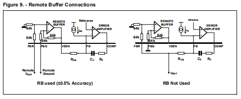 该装置集成了一个远程传感缓冲器,使得输出电压远程传感的实现不需要任何其他外部组件。通过这种方式,编程的输出电压在远程缓冲输入之间调节,如果设备用于VRM,则补偿主板跟踪损耗或连接器损耗模块。极低偏移放大器通过引脚FBR和FBG(FBR)远程感测输出电压用于调节电压检测,而FBG用于接地检测),并在VSEN内部报告该电压统一增益引脚消除错误。保持FBR和FBG轨迹平行并由电源保护平面会导致任何拾取噪声的共模耦合。如果不需要远程感应,将RFB直接连接到调节电压就足够了:VSEN变成未连接,仍通过远程缓冲器感应输出电压。在这种情况下,FBG和FBR引脚必须连接到规定电压(见图10)。远程缓冲器包括在微调链中,以便在输出电压上达到±0.5%的精度当使用RB时:将其从控制回路中消除会导致RB增加调节误差抵消了设备性能的恶化。