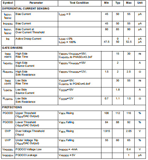 集成的大电流驱动器允许使用不同类型的功率MOS(也可以使用多个MOS来减少保持快速切换转换。高压侧mosfet的驱动器使用BOOTx引脚供电,PHASEx引脚用于返回。的驱动程序低压侧MOSFET使用VCCDRV引脚供电,PGND引脚用于回路。在VC CDRV引脚处需要至少4.6V的电压才能开始设备的操作。该控制器包含一个复杂的防击穿系统,以尽量减少低侧体二极管的传导时间保持良好的效率节省肖特基二极管的使用。死区时间减少到几纳秒,确保高侧和低侧MOSFET不会同时开启:当高侧mosfet关闭时,其源上的电压开始下降;当电压达到2V时,低侧mosfet栅极驱动器施加30ns延迟。当低侧mosfet关闭时,检测LGATEx引脚上的电压。它下降到1V以下,高侧mosfet栅极驱动采用延迟30ns。如果电感为负,高边mosfet的源永远不会下降。