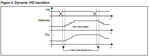 该设备能够管理动态视频代码更改,允许在正常设备操作期间修改输出电压。该设备检查每个时钟周期(与PWM斜坡同步)的VID代码修改。一旦新代码在一个以上的时钟周期内保持稳定,则引用将逐步递增或递减每时钟周期增加25mV,直到达到新的VID代码。在转换过程中,VID代码会发生变化忽略;设备在转换完成后重新开始监视VID。好的,信号在转换过程中被屏蔽,当OVP/UVP仍处于活动状态时,信号在转换完成后被重新激活。