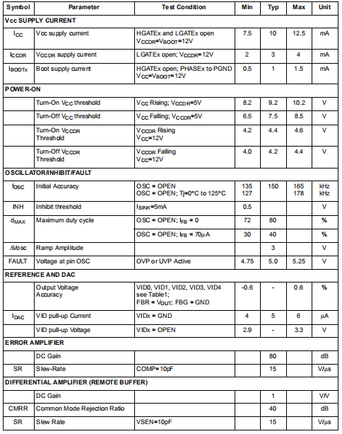 该装置是一种电源控制器设计用于提供高性能DC/DC大电流微处理器的转换。这个该装置实现了一个双相降压控制器,各相之间有180°的相移阶段。一种精确的5位数模转换器(DAC)允许调整输出电压0.800V至1.550V,25mV二进制步骤,实时管理视频代码更改。高精度内部基准确保所选输出电压应在±0.6%范围内。这个高峰值电流门驱动器提供快速切换到提供低功耗的外部功率mos开关损耗。该装置保证了对负载的快速保护过电流和负载过压/欠压。提供一个内部撬棍,在较低的一侧转动mosfet,如果检测到过电压。万一过流,系统以恒流模式工作。