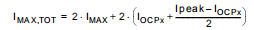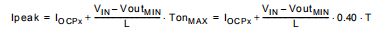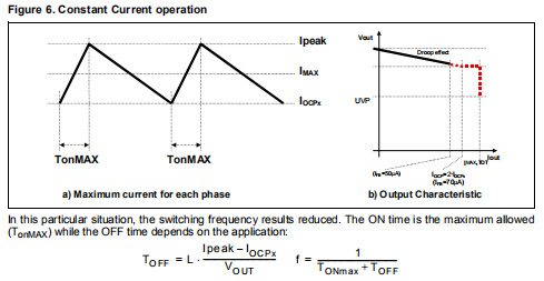 因为该器件可以感应到低侧mosfet的输出电流(或串联的感应电阻)设备限制了电感器电流三角形波形的底部:检测到过电流当流入检测元件的电流大于IOCPx(IINFOx>35μA)时。现在引入最大导通时间与电流的关系(其中T是开关周期T=1/fSW):