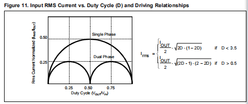 输入电容器的设计主要考虑输入均方根电流,而输入均方根电流取决于占空比如图11所示。考虑到双相拓扑结构,输入均方根电流较低单相运行。