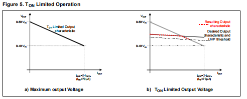 当每相电流达到IOCPx(IINFOx)之前达到最大接通时间时,就会发生这种情况<35μA)。图5a显示了考虑到功率限制,器件能够调节的最大输出电压由以前的关系强加的。如果期望的输出特性超过了吨限制的最大输出过电压后产生的输出电压会下降。在这种情况下,设备不执行恒流限制,而只限制前一关系后的最大接通时间。在检测到UVP或IFB=70μA之前,输出电压遵循产生的特性(如图5b所示)。