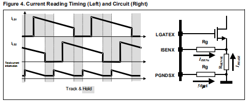 通过低压侧MOSFET RdsON或通过一个感应电阻(RSENSE)并在内部转换成电流。给出了传输电导比通过外部电阻Rg放置在芯片外部,朝向读取点的ISENx和PGNDSx引脚之间。全差分电流读数可抑制噪声,并允许将传感元件放置在不同位置,而不影响测量精度。电流读取电路在低侧mosfet是开(关时间)。在这段时间内,反应保持针ISENx和PGNDSx在相同的电压下,当读取电路关闭时,内部钳位保持这两个相同电压下的引脚从ISENx引脚上沉下必要的电流(如果低侧mosfet RdsON需要执行sense是为了避免在ISENx引脚上克服绝对最大额定值)。专利的电流读取电路允许非常精确和高带宽的读数,无论是正极还是负电流。该电路以高速再现流过传感元件的电流跟踪保持传输电导放大器。特别是,它在关闭的后半段读取电流由于mosfet的开启,减少了噪声注入到器件中的时间(见图4)。跟踪时间必须至少为200纳秒,以正确读取输送电流该电路从PGNDSx引脚提供恒定的50μa电流,并使引脚ISENx和PGNDSx保持在相同的电压。参考图4,ISENx引脚中的电流由下式给出公式: