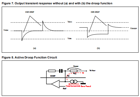 该器件采用下垂函数来满足高性能微处理器的要求,降低了功耗输出电容器的尺寸和成本。这种方法“恢复”了负载瞬态中由于输出电容ESR引起的部分压降,从而引入了输出电压与负载电流的依赖关系如图7所示,ESR降在任何情况下都存在,但使用降速函数,则输出电压最小。实际上,降速功能引入了与输出电流成比例的静态误差(图8中的VDROOP)。由于设备具有平均电流模式调节,因此提供的总电流用于实现降速功能。该电流(等于两个IINFOx之和)来自FB引脚。在这个引脚之间连接一个电阻和VOUT,总电流信息只在这个电阻中流动,因为补偿网络之间FB和COMP总是串联一个电容器(见图8)。调节电压等于: