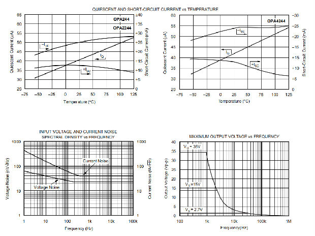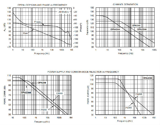 所有版本都提供微型表面安装包装.OPA244(单一版本)有微型5引线SOT-23-5表面安装、SO-8表面安装和8针DIP。OPA2244(双版本)可用于MSOP-8表面安装、SO-8表面安装和8针DIP。OPA4244(quad)采用TSSOP-14表面安装。它们在-40°C到+85°C之间完全指定,在-55°C到+125°C下工作。SPICE宏模型可用于设计分析。