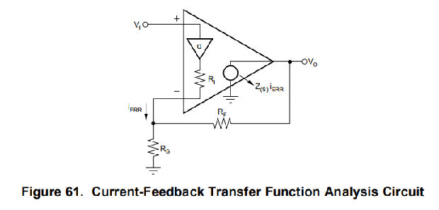 电流反馈运算放大器感测反相节点中的误差电流(与电压反馈运算放大器的差分输入误差电压相反),并通过内部频率相关的跨阻增益将其传递到输出。典型特性表明这种开环跨阻响应。这类似于电压反馈运算放大器的开环电压增益曲线。发展图64电路的传递函数得出等式9: