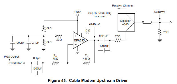这种电路的另一个选择是使用两个OPA695s驱动输出变压器的差分驱动器。这可以用来将可用的线路功率加倍,或者通过将每个阶段所需的输出摆幅减半来改善失真。MCNS规范要求的通道禁用必须通过使用PGA禁用功能来实现。MCNS禁用规范要求在信号通道关闭的情况下保持输出阻抗匹配。OPA695的禁用特性主要用于节能,并将输出和逆变输入引脚置于高阻抗模式。这不能保持所需的输出阻抗匹配。在图55的输入端关闭信号,同时保持OPA695激活,保持阻抗匹配,同时使线路上的噪声很小。由于OPA695的低输入噪声,图55电路(PGA源关闭,但仍呈现75Ω源阻抗)的线路噪声将非常低4 nV/√Hz(–157 dBm/Hz)。