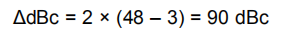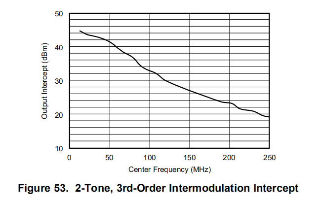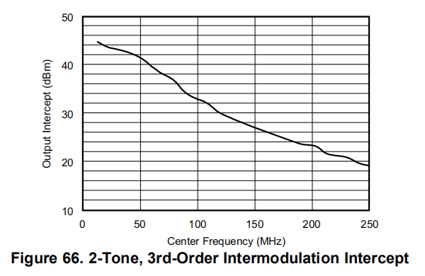 这种反向输入差分配置适用于高SFDR转换器接口,特别是窄带中频通道。典型特性表明,在90mhz范围内,2音、3阶互调截距超过45dbm。虽然这些数据是在800Ω的负载下采集的,但截获模型似乎适用于该电路,将功率电平视为50Ω。例如,在70兆赫时,差分典型特征图显示了48 dBm的截距。为了预测2音互调SFDR,假设2-VPP最大差分输入转换器低于满标度包络-1-dB,每个音调的测试功率电平将为9 dBm–6 dBm=3 dBm。将其放入截距方程中,得到: