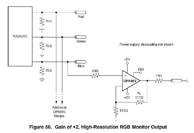 OPA695的极高带宽以+2的增益运行,支持诸如辅助监视器驱动等应用的最快RAMDAC输出。增益2V/V视频线驱动器显示了在125MHz时0→+1V输入方波的测量性能。一般来说,放大器所需的全功率带宽必须至少为像素速率的一半。OPA695的非互易增益为+2,转换速率为2900V/μs,标准RGB视频电平的输出引脚电压摆幅为1.4VPP,带宽为600MHz,可支持高达1.26GHz的像素速率。图56显示了一个例子,其中三个opa695为高分辨率RGB RAMDAC提供辅助监视器输出。