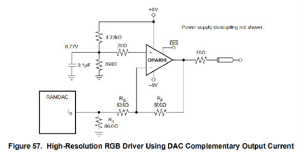 从一个高转换速率的视频转换电路,从一个更高的带宽转换到一个高带宽的视频转换电路。这将提供比图56的电路更清晰的像素边缘。大多数高速数模转换器都是电流控制设计,既有用于视频的输出电流信号,也有通常被丢弃到匹配电阻器中的互补输出。互补电流输出可以作为辅助输出,如果它是反向的,如图57所示。在图57的电路中,互补电流输出端接一个等效的75Ω阻抗(RT和RG的并联组合),该阻抗还提供了一个电流分割,以减少通过反馈电阻器RF的信号电流。这使得RF可以增加到保持平坦频率响应的值。由于互补电流输出基本上是一个反向的视频信号,该电路在OPA695的输出端为零DAC输出电流设置一个白色视频电平(在非反转输入端使用0.77伏直流偏压),然后反转互补输出电流,以产生从零输出电流时的1.4伏到最大输出电流电平下的0伏的信号(假设最大输出电流为20毫安)。这提供了一个非常宽带(>800兆赫)视频信号能力。