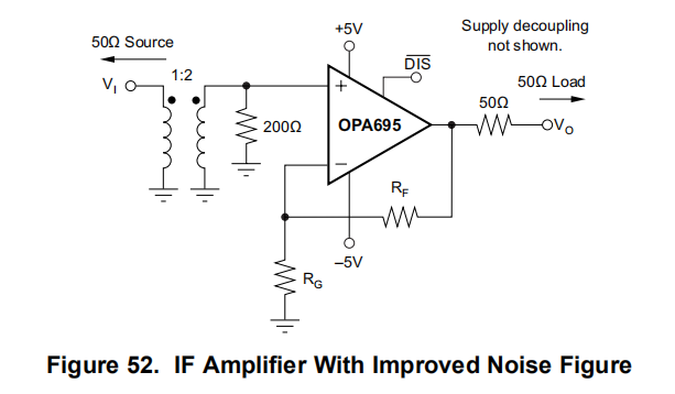 该变压器提供了一个无噪声的电压增益,以牺牲较高的源阻抗,为OPA695无转换输入电流噪声。变压器二次侧的200Ω电阻器仍将输入阻抗设置为50Ω。一个1:2匝比的变压器将把200Ω作为50Ω的阻抗反射到变压器的输入侧。使用1:2的升压变压器也可以将所需的放大器增益降低1/2,以获得任何特定的期望整体增益。