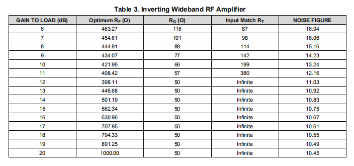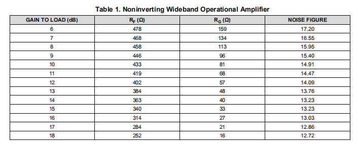 图48和图49中使用的特定电阻值为匹配负载提供了最大平坦带宽和12 dB增益。噪声系数部分的设计表总结了图48和图49所示电路在期望增益范围内所需的电阻值。