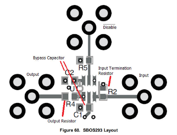 如布局指南和图68所示,输入端接电阻器、输出电阻器和旁路电容器必须靠近放大器。电源和接地板放在放大器下面,但必须从输入和输出引脚下拆下,如图68所示。