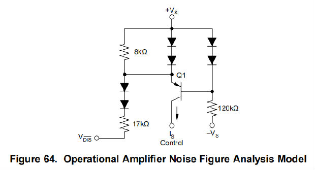 在正常运行中,通过120-kΩ电阻器向Q1提供基极电流,而通过8-kΩ电阻器的发射极电流会产生一个不足以使Q1发射极中的两个二极管打开的电压降。当电流拉低时,额外的电流通过8-kΩ电阻器,最终接通这两个二极管(≈180μA)。在这一点上,任何进一步的电流从VDIS中抽出 通过那些二极管保持发射极基极电压Q1约为0伏。这切断了集电极电流Q1,关闭放大器。关机模式下的电源电流仅为运行图64所示电路所需的电流。