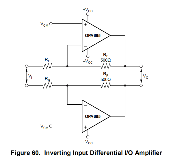 图60显示了配置为逆变放大器的差分I/O级。在这种情况下,增益电阻(RG)成为电源输入电阻的一部分。这提供了比无反转配置更好的噪声性能,但限制了将输入阻抗与增益分开设置的灵活性。