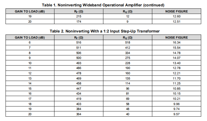 表1、表2和表3总结了作为精密中频放大器运行的OPA695的三个电路选项在所需增益设置上的建议电阻值和产生的噪声值。在每种情况下,RF和RG都会根据最佳带宽和所需增益进行调整。