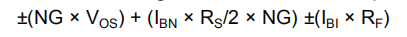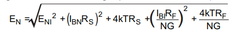 将该表达式除以噪声增益(NG=(1+RF/RG))得到非反转输入处的等效输入参考点噪声电压,如等式13所示: