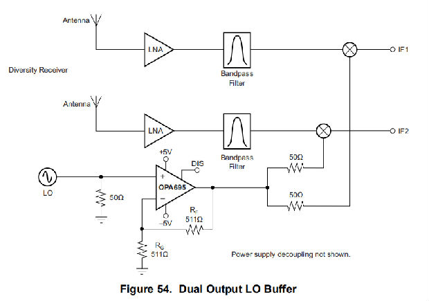 OPA695还可用于缓冲混频器的本振(LO)。在+2的电压增益下工作,OPA695为本振提供了近乎完美的负载隔离,混频器的净增益为0分贝。可考虑通过1.4GHz服务水平的应用,但最佳运行条件是服务水平<1.0GHz,增益为+2。OPA695还可以提供增益,以驱动混频器的更高功率电平。OPA695作为LO缓冲器的一个选项如图54所示。因为OPA695可以驱动多个输出负载,两个相同的本振信号可以通过两个串联的50Ω输出电阻分接输出到分集接收机中的混频器。该电路设置为输出引脚的电压增益为+2V/V,混频器的增益为+1V/V(0dB),但可以很容易地进行调整以提供更高的增益。