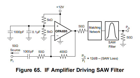 中频带的一个常见要求是用足够的增益缓冲混频器的输出,以恢复窄带SAW滤波器的插入损耗。图65显示了驱动声表面波滤波器的一种可能的配置。图53显示了50Ω负载下的截距。该电路在电压增益为–8 V/V的逆变模式下工作,使用增益设置电阻器提供50Ω的输入匹配,具有针对最大带宽(在本例中为700 MHz)优化的反馈,并通过50Ω的输出电阻在SAW滤波器的输入端进入匹配网络。如果声表面波滤波器的插入损耗为12分贝,则在声表面波滤波器的通带中,在声表面波输出端(可能是下一个中频放大器或混频器的输入阻抗)的50Ω负载的净增益为0分贝。在这个应用中使用OPA695将第一混频器与SAW滤波器的阻抗隔离,并在SAW滤波器带宽中提供非常低的二阶、三阶杂散电平。反向操作可提供最宽的带宽,最大增益为–12V/V(15.6dB)。无反转操作在增益设置高于此值时提供了更高的带宽,但也会略微降低截获和噪声系数性能。