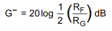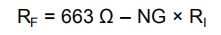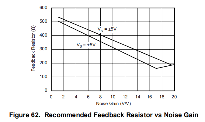 随着期望信号增益的增加,这个方程最终将预测一个负的射频。通过将RG保持在最小值10Ω,可以设置此调整的主观限制。如果RF太低,较低的值将在输入级和输出级加载缓冲级,从而降低带宽。图62显示了±5 V和单个+5 V操作的推荐RF与NG。方程8中使用的+5-V操作的最佳目标反馈阻抗为663Ω,而典型的缓冲器输出阻抗为32Ω。所示的RF与gain的值大致等于用于生成典型特性曲线的值。在某些情况下,使用的值与此处显示的值稍有不同,因为在典型特性中使用的值也对简化分析中未考虑的板寄生进行校正,从而得出方程式11。图62所示的值为需要带宽优化和需要平坦频率响应的设计提供了一个良好的起点。