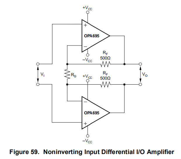 OPA695提供了非常低的三阶失真项,对于单放大器操作来说,它具有主要的二阶失真。对于最低失真,特别是在需要差分输出的情况下,在差分I/O设计中操作两个OPA695s可以抑制这些偶数阶项,通过高频率和高功率提供极低的谐波失真。差分输出通常是高性能ADC、双绞线驱动和混频器接口的首选。实现差分I/O的两种基本方法是无反转或反转配置。因为输出是差分的,所以信号的极性有点无意义;这里的“非反转”和“反转”术语适用于将输入带到两个OPA695s中的情况。每种方法都有其优缺点。图59显示了非反转差分I/O应用程序的基本起点。