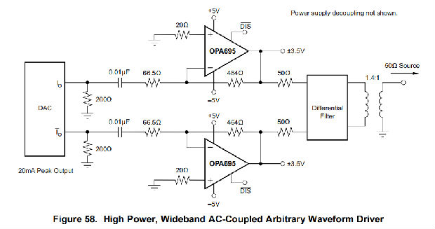OPA695可作为中等输出功率任意波形驱动器应用的输出级。当在±5 V电源上操作OPA695时,通过一个50Ω的串联匹配电阻器驱动至50Ω匹配负载,可在匹配负载(15 dBm)下实现高达4.0-VPP的摆动。此功率水平可用于增益为±8,且通过100 MHz平坦响应。当直接从互补电流输出DAC接口时,考虑图57中的电路,该电路针对所考虑的特定DAC的峰值输出电流进行了修改。如果需要来自互补电流输出DAC的纯交流耦合输出信号,考虑使用图58电路的推挽输出级。这里的电阻值是为20毫安峰值输出电流DAC计算的,在匹配负载(18 dBm)下产生高达5-VPP的摆动。这种方法在负载下提供更高的功率,同时具有较低的二次谐波失真。