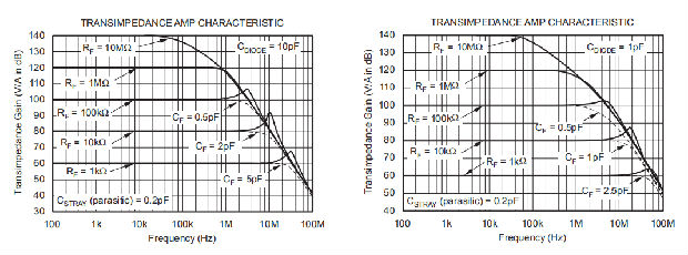 这些方程将导致最大跨导带宽。对于更高的跨阻带宽,可以使用高速CMOS OPA300(SBOS271(180mhzgbw))或OPA656(SBOS196(230mhzgbw))。