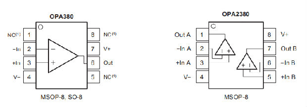 OPA380(单)有MSOP-8和SO-8封装。OPA2380(双)可在微型MSOP-8封装中使用。规定温度范围为-40°C至+125°C。