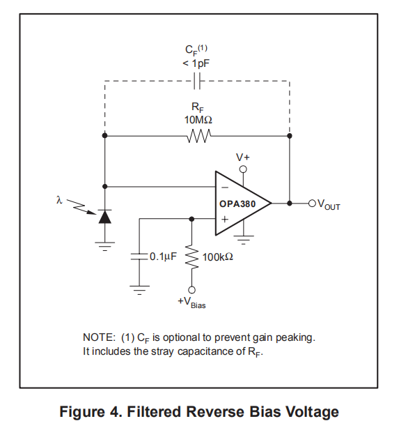 当光电二极管不暴露在任何光下时,+IN输入可以用正直流电压来偏置输出电压,并允许放大器输出指示真正的零光电二极管测量。它还可以防止因负轨而产生的额外延迟。这种偏压出现在光电二极管上,为更快的操作提供了反向偏压。放置在这个偏压点的RC滤波器将减少噪声,如图4所示。该偏置电压也可以作为范围不包括接地的ADC的偏移偏置点。