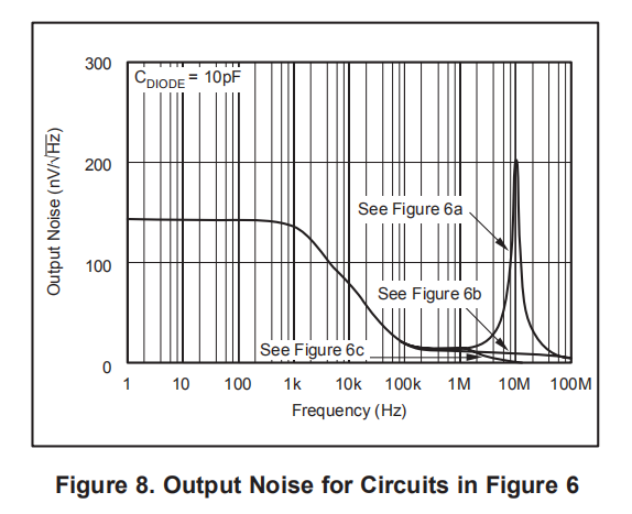 总噪声随着带宽的增加而增加。将电路带宽限制在所需的范围内。在反馈电阻RF上使用电容器CF来限制带宽,即使在考虑总输出噪声时不需要稳定性。